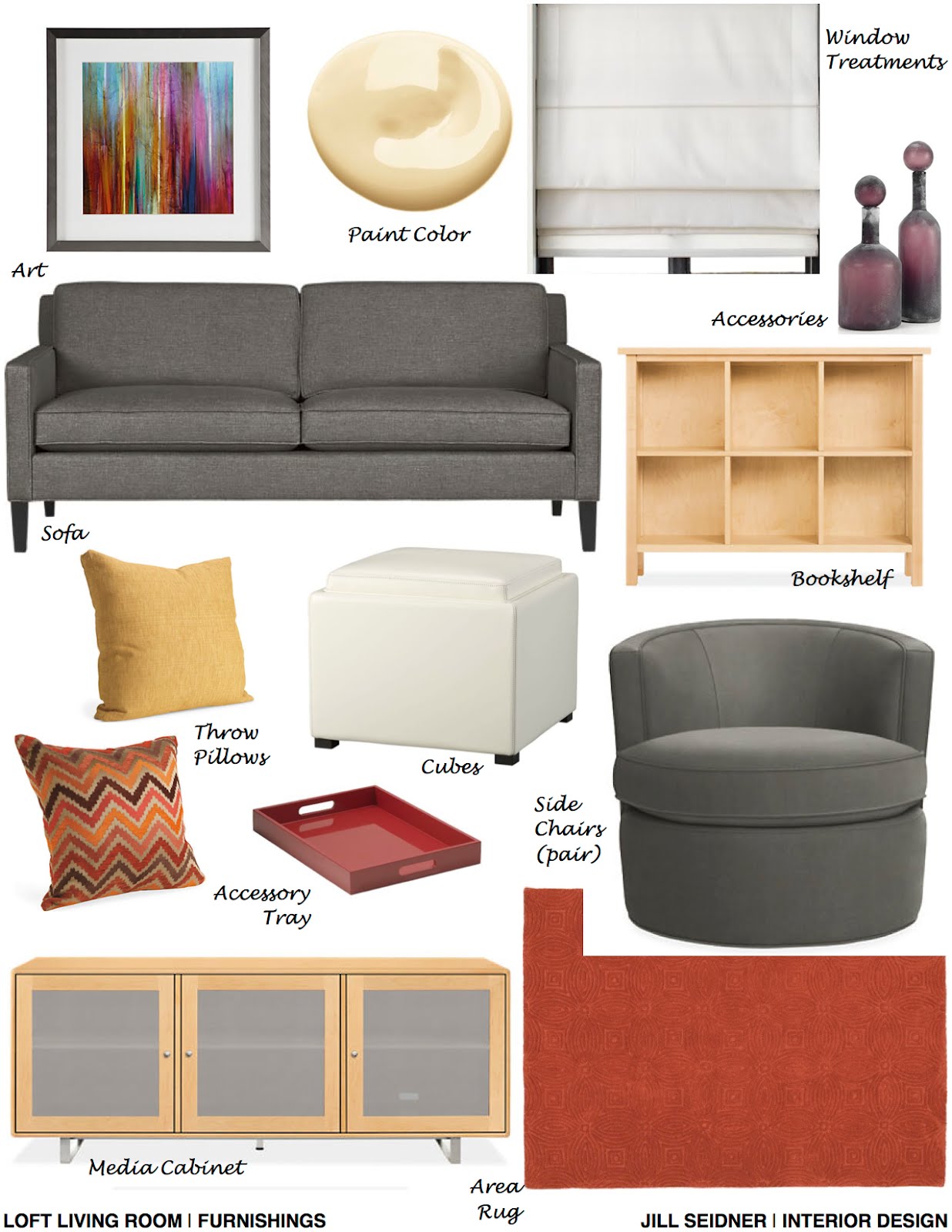 Arlington, VA Online Design Project Loft Living Room Furnishings Concept Board